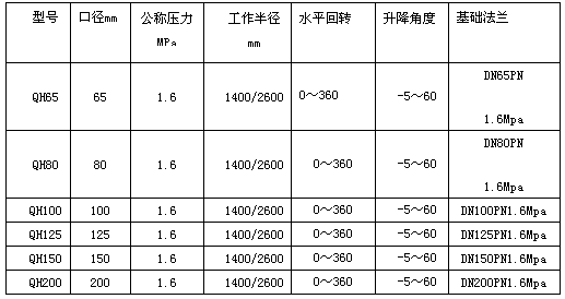 一、用途: 適用于各石油庫(kù)發(fā)放各類燃料油,也可用于化工及其它行業(yè)收、發(fā)各類液體原料的汽車灌裝作業(yè)。 二、型號(hào)含義: QH - DN型(Q-汽車、H-鶴管、DN-口經(jīng) 65 80 100 125 150 200) 三、技術(shù)參數(shù):